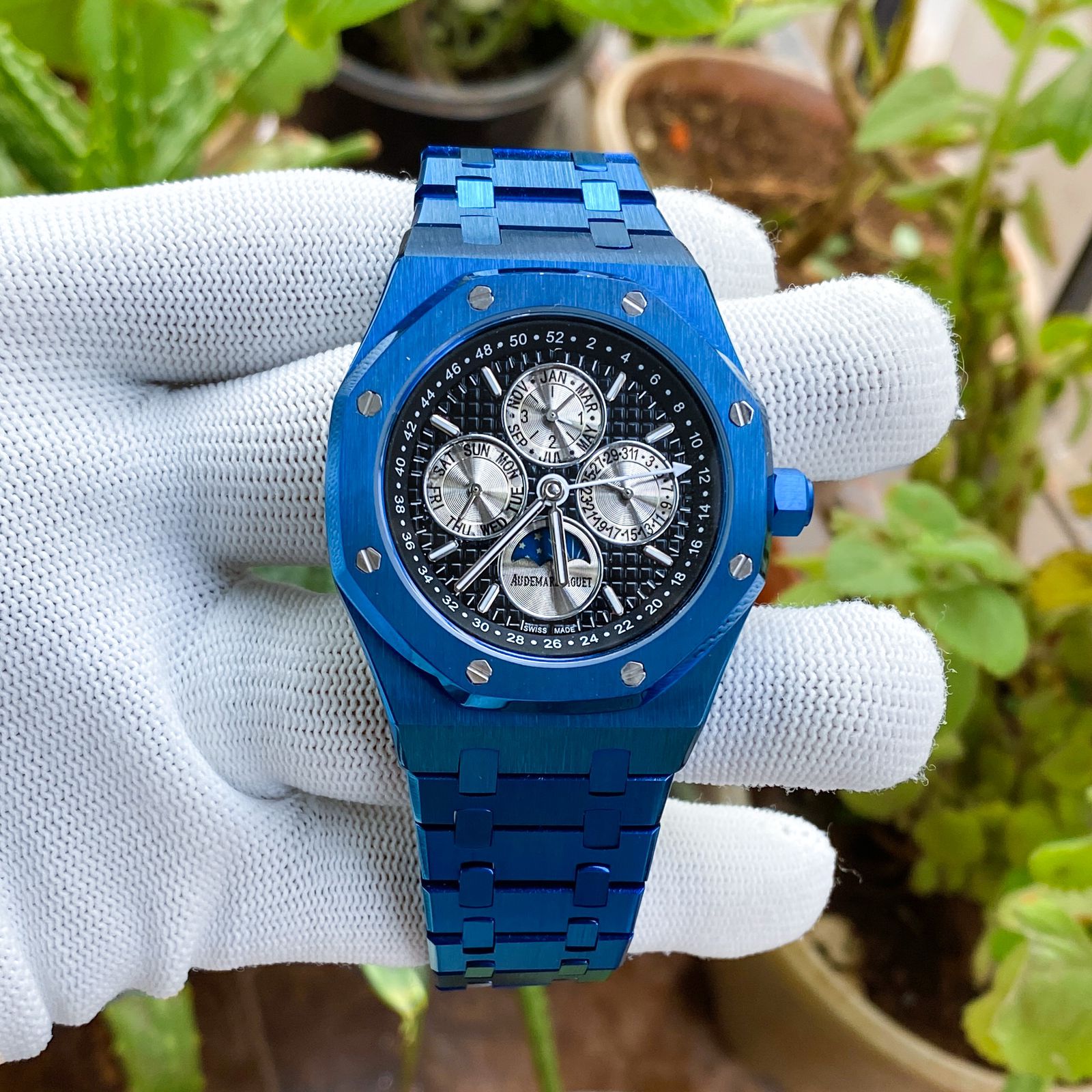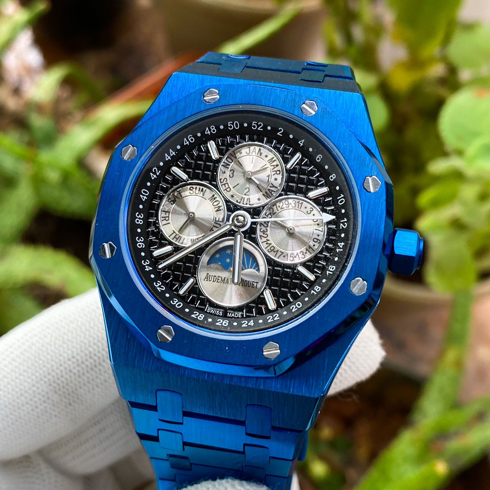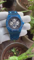 Features: Powered by original Japanese self-winding automatic machinery, Stainless- Silver case With Frosted Blue Bezel and Steel chain, Anti-reflective scratch resistant sapphire glass on a White dial, fastened by Original AP lock.