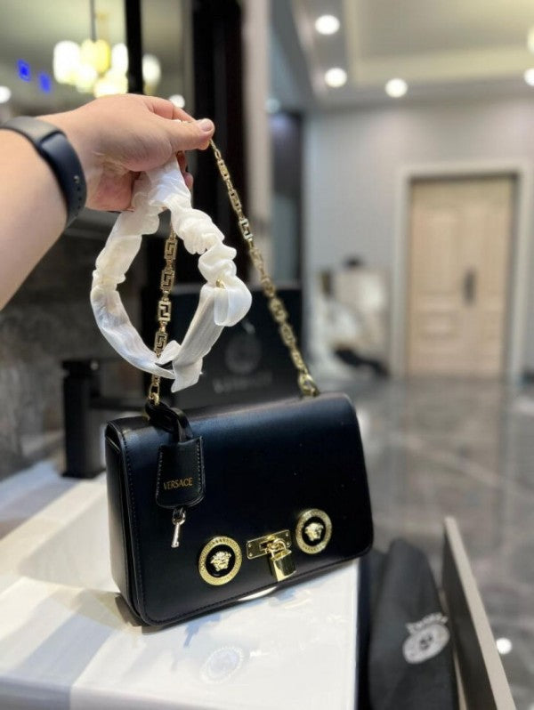 Material: Crafted from premium faux leather with a polished finish and crystal-studded Medusa logo, complete with gold-tone hardware.